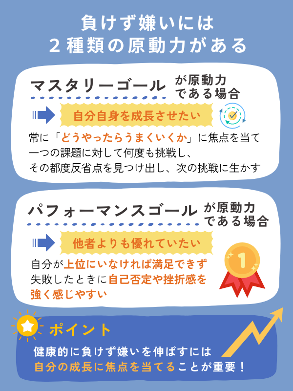 「負けず嫌い」の原動力として、心理学では「マスタリーゴール」と「パフォーマンスゴール」の2種類があるとされています。