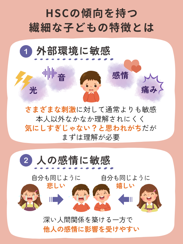 HSCの傾向がある子どもの特徴の一つに音、光、感情、痛みなど、さまざまな刺激に対して通常よりも敏感であることが特徴です。