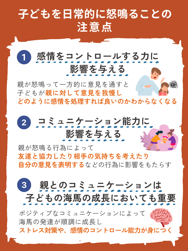 親が日常的に怒鳴るなど、一方的に親の感情を押し付けてしまうことで、子どもの海馬の成長に影響をもたらす可能性があると考えられます。