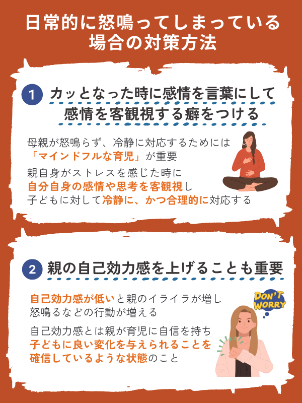 そのため、最近つい怒鳴ってしまうと感じている方は、自分自身の感情をコントロールしたり、自己効力感を高めるためにも他人の成功事例から学ぶことで、より冷静かつ適切に子どもに接することができるでしょう。