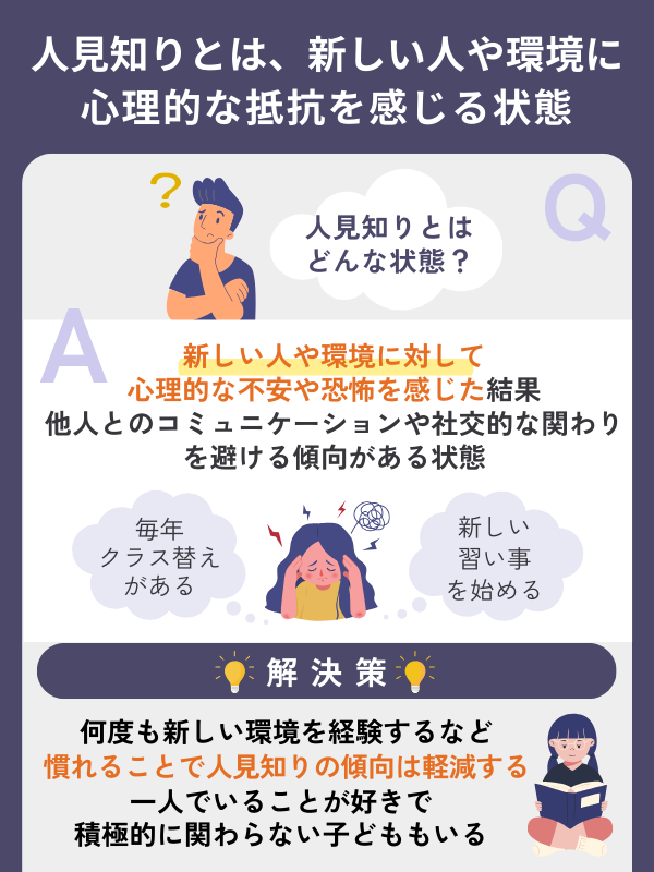特に子どもが置かれる環境では、毎年クラス替えがあったり、習い事を始めたりと新しい環境への移り変わりが多く、この心理状況(人見知り)が起きやすくなります。