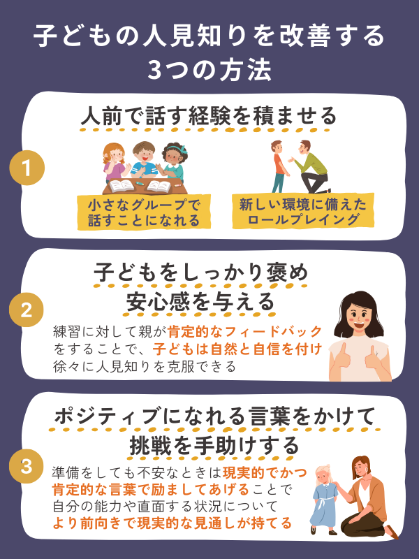 ステップ1の行動に対して、親が肯定的なフィードバックをすることで、子どもは自然と自信を付け、徐々に人見知りを克服していきます。